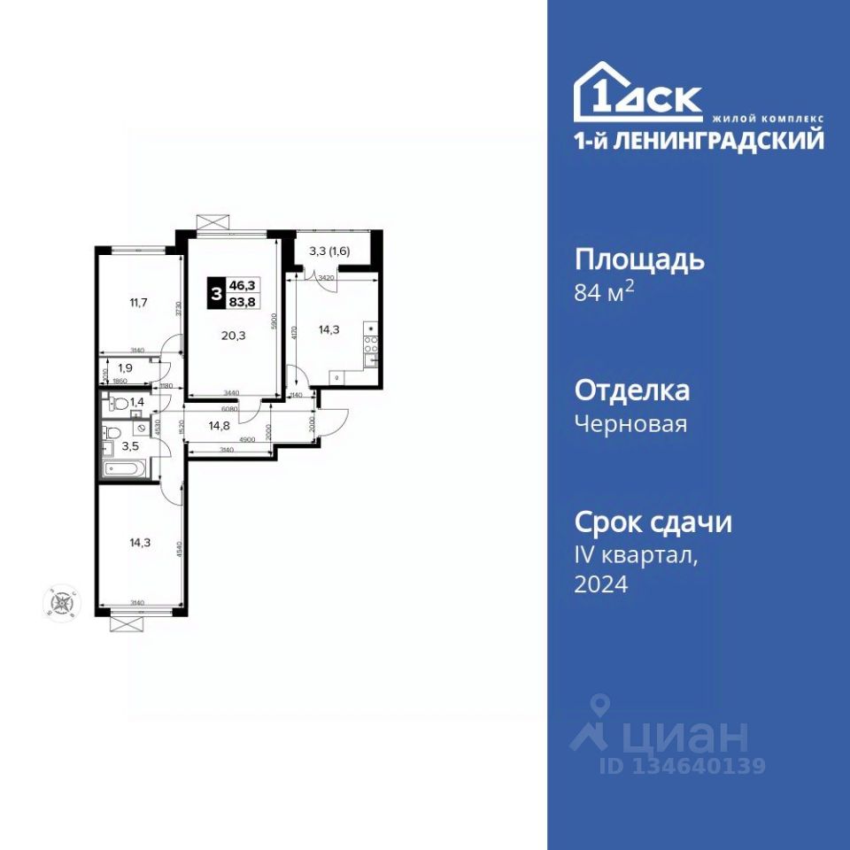 Продаётся 3-к квартира номер 128 общей площадью 84.1 кв.м. на 7-м этаже 14 этажного дома. Отделка Whitebox.