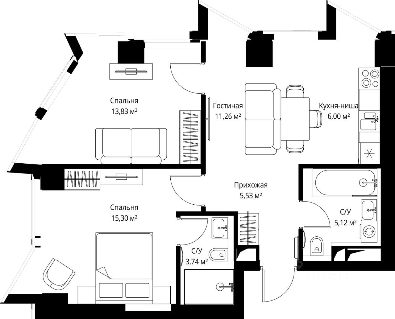 Продаётся 2-комнатная квартира площадью 60.78 м² с предчистовой отделкой на 4-м этаже премиального небоскреба Famous.