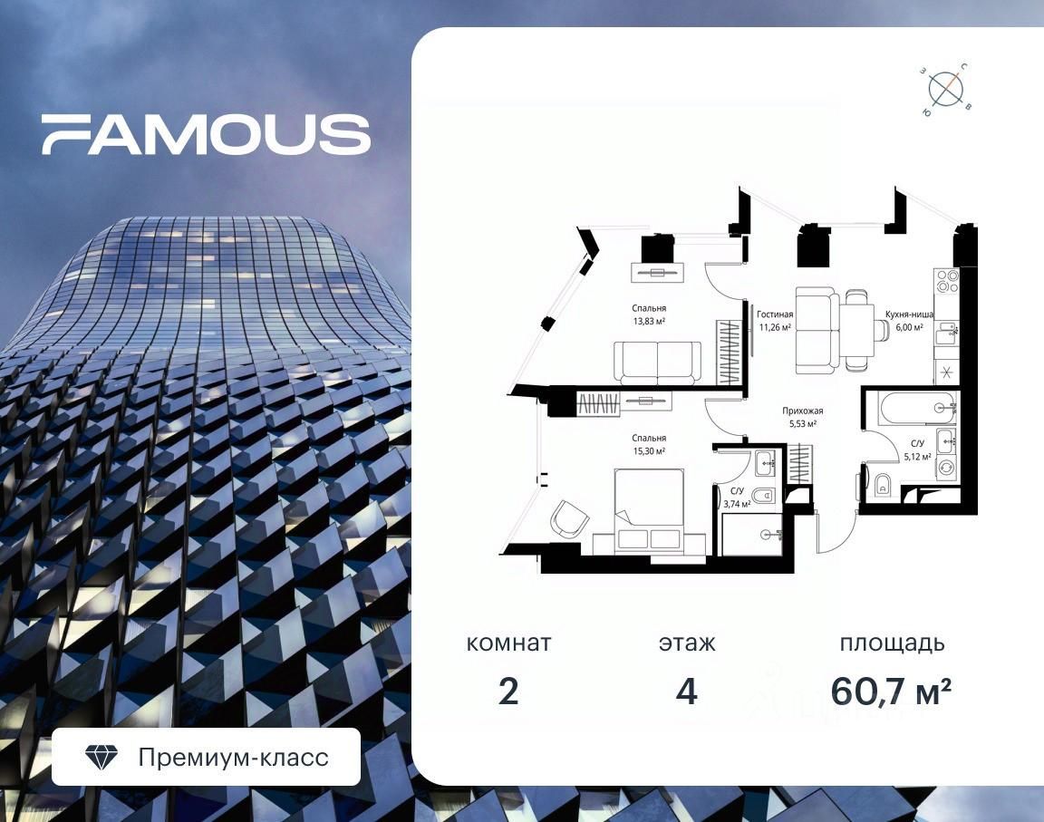 Продаётся 2-комнатная квартира площадью 60.70 м² с предчистовой отделкой на 4-м этаже премиального небоскреба Famous.