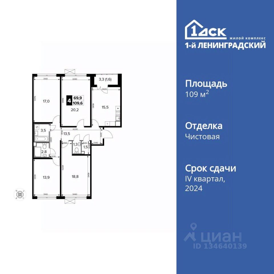 Продаётся 4-к квартира номер 302 общей площадью 109.9 кв.м. на 5-м этаже 14 этажного дома. Чистовая отделка.