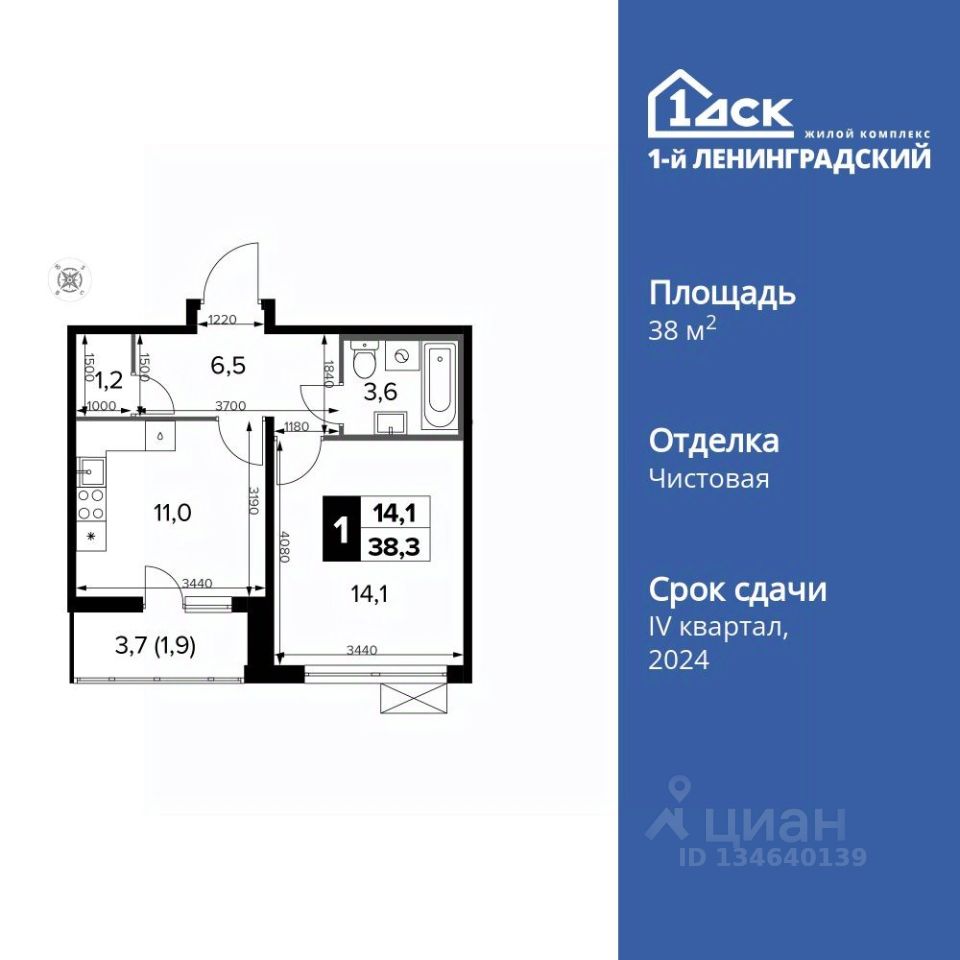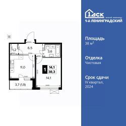 Продаётся 1-к квартира номер 312 общей площадью 38.4 кв.м. на 8-м этаже 14 этажного дома. Чистовая отделка.