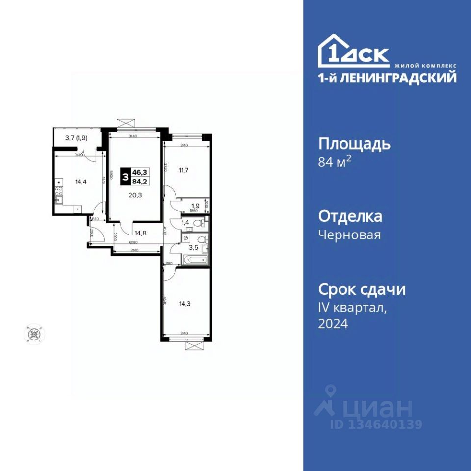 Продаётся 3-к квартира номер 412 общей площадью 84.4 кв.м. на 14-м этаже 14 этажного дома. Отделка Whitebox.
