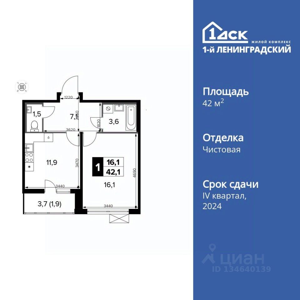Продаётся 1-к квартира номер 462 общей площадью 42.2 кв.м. на 13-м этаже 14 этажного дома. Чистовая отделка.