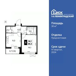 Продаётся 1-к квартира номер 514 общей площадью 38.4 кв.м. на 13-м этаже 14 этажного здания. Отделка Whitebox. Цена с учётом скидки.