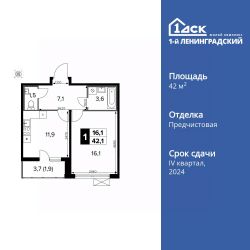 Продаётся 1-к квартира номер 546 общей площадью 42.2 кв.м. на 8-м этаже 14 этажного здания. Отделка Whitebox. Цена с учётом скидки.