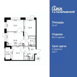 Продаётся 3-к квартира номер 523 общей площадью 69.7 кв.м. на 14-м этаже 21 этажного дома. Без отделки.