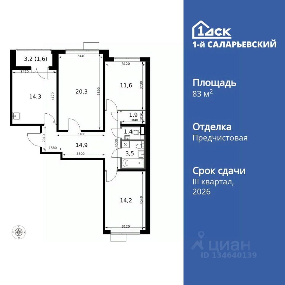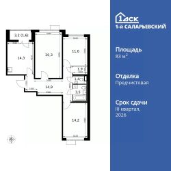 Продаётся 3-к квартира номер 1 общей площадью 83.7 кв.м. на 2-м этаже 9 этажного здания. Отделка Whitebox. Цена с учётом скидки.