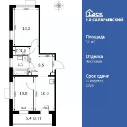 Продаётся 2-к квартира номер 111 общей площадью 51.1 кв.м. на 13-м этаже 24 этажного здания. Чистовая отделка. Цена с учётом скидки.