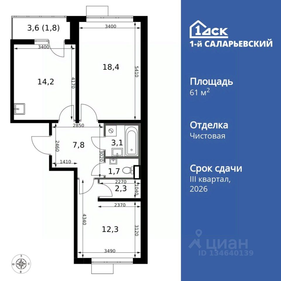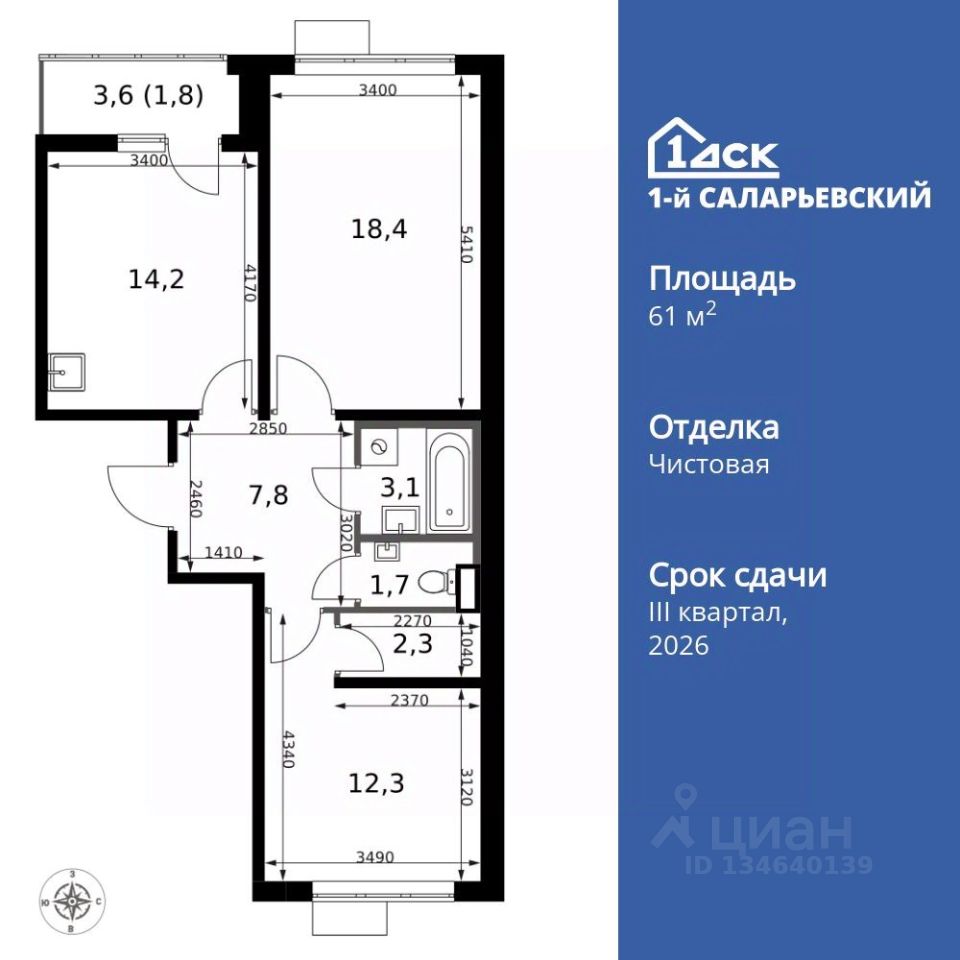 Продаётся 2-к квартира номер 66 общей площадью 61.6 кв.м. на 6-м этаже 24 этажного здания. Чистовая отделка. Цена с учётом скидки.