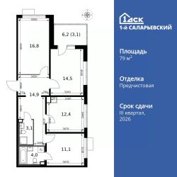 Продаётся 3-к квартира номер 281 общей площадью 79.9 кв.м. на 12-м этаже 12 этажного здания. Отделка Whitebox. Цена с учётом скидки.