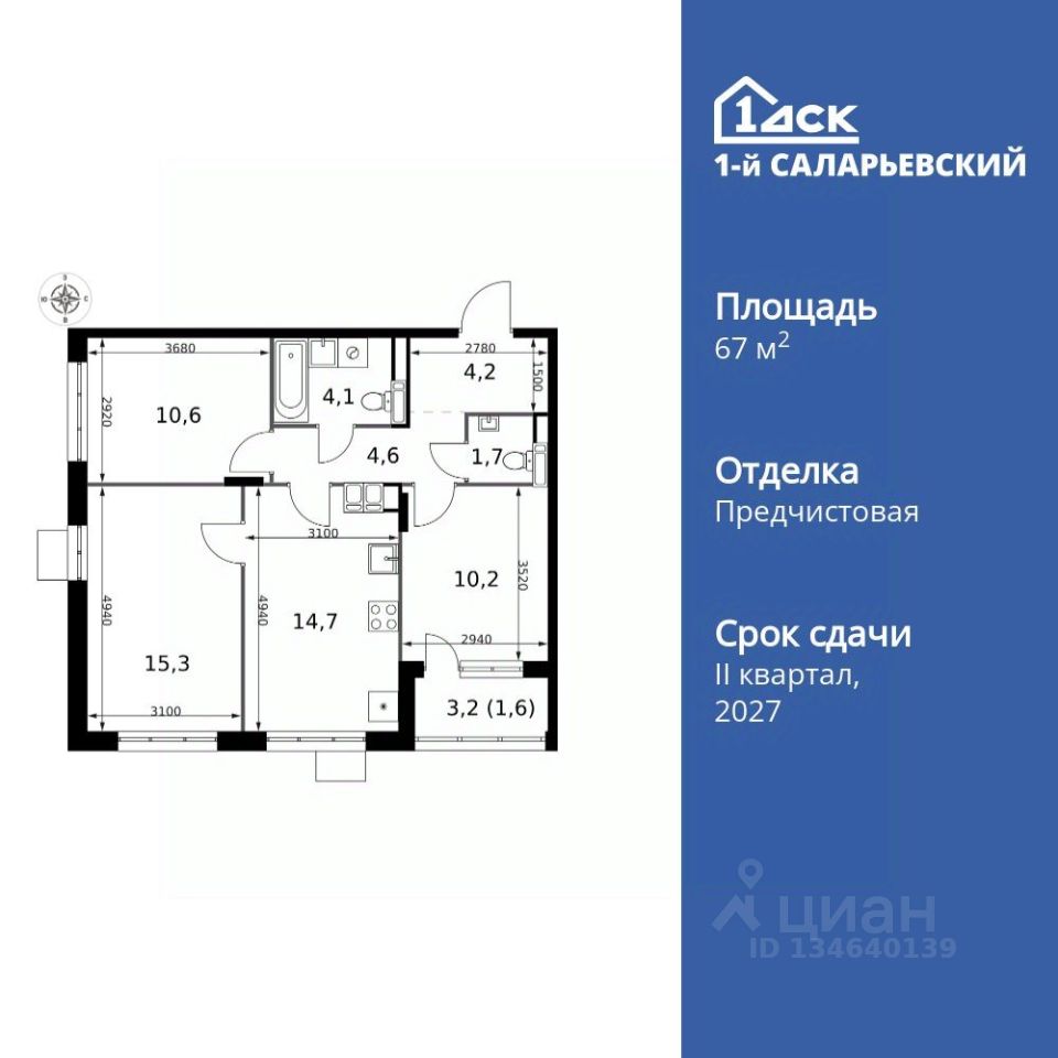 Продаётся 3-к квартира номер 147 общей площадью 67 кв.м. на 15-м этаже 25 этажного здания. Отделка Whitebox. Цена с учётом скидки.