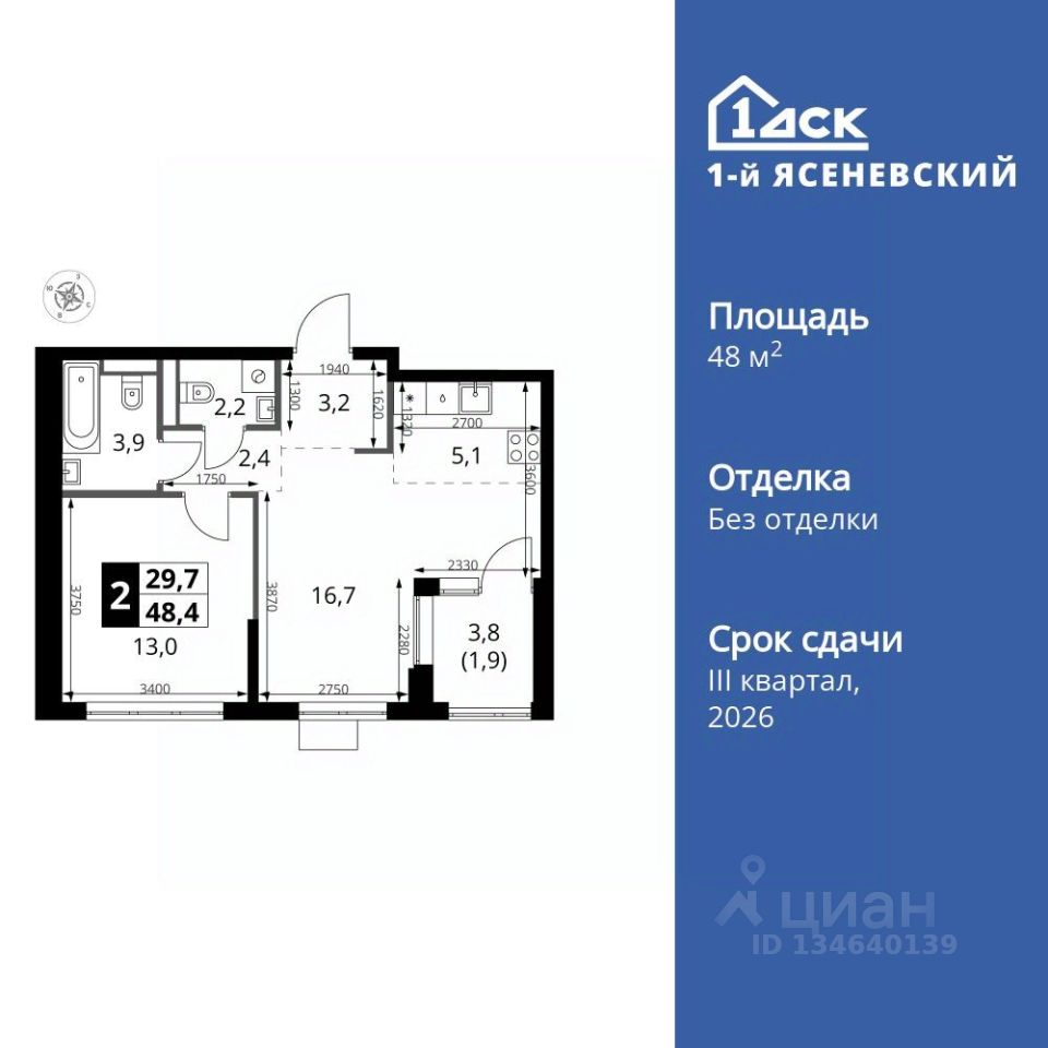 Продаётся 2-к квартира номер 332 общей площадью 48.4 кв.м. на 18-м этаже 18 этажного здания. Без отделки. Цена с учётом скидки.