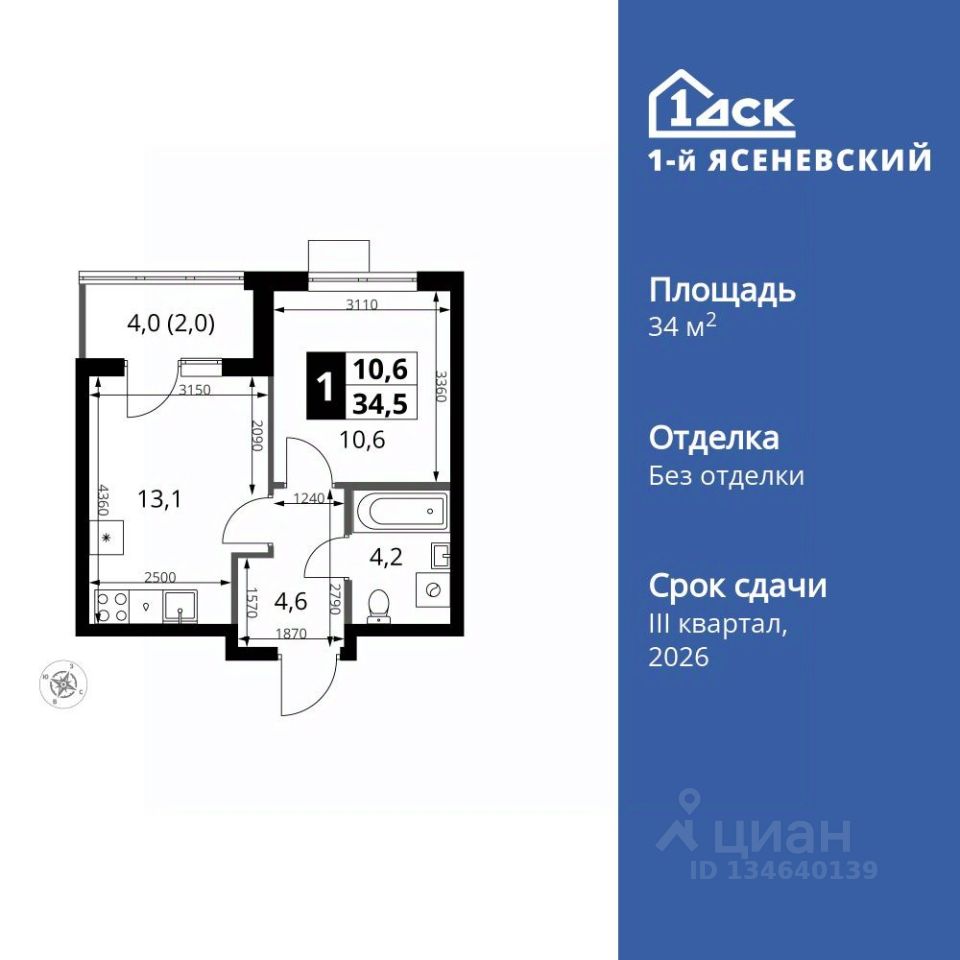 Продаётся 1-к квартира номер 334 общей площадью 34.5 кв.м. на 18-м этаже 18 этажного дома. Без отделки.