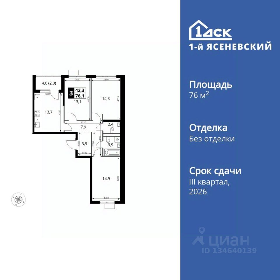 Продаётся 3-к квартира номер 416 общей площадью 76.1 кв.м. на 9-м этаже 9 этажного здания. Без отделки. Цена с учётом скидки.