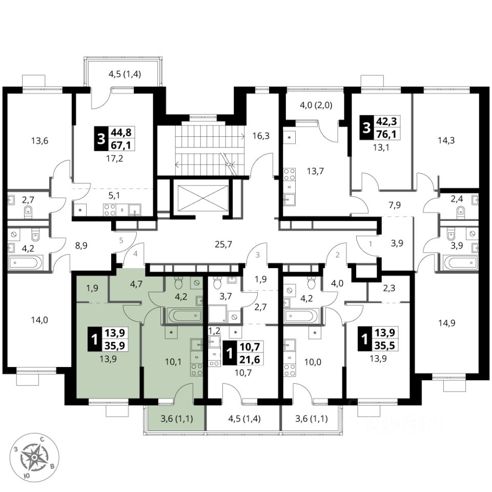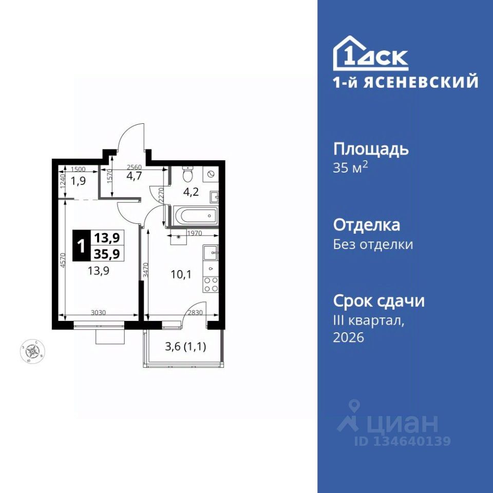 Продаётся 1-к квартира номер 419 общей площадью 35.9 кв.м. на 9-м этаже 9 этажного здания. Без отделки.