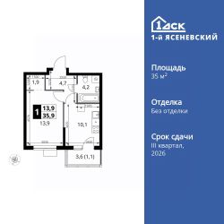 Продаётся 1-к квартира номер 384 общей площадью 35.9 кв.м. на 2-м этаже 9 этажного здания. Без отделки.