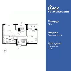 Продаётся 2-к квартира номер 429 общей площадью 57.1 кв.м. на 2-м этаже 18 этажного здания. Отделка Whitebox. Цена с учётом скидки.