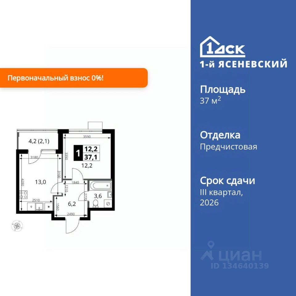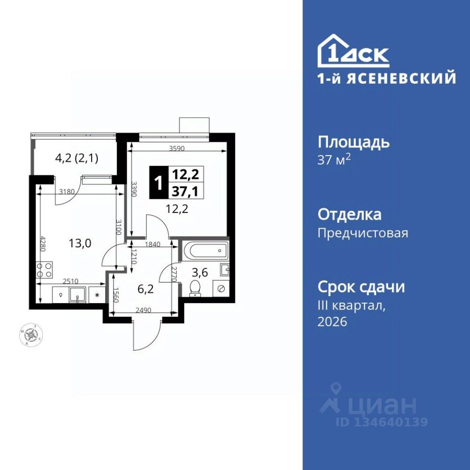 Продаётся 1-к квартира номер 430 общей площадью 37.1 кв.м. на 2-м этаже 18 этажного здания. Отделка Whitebox.