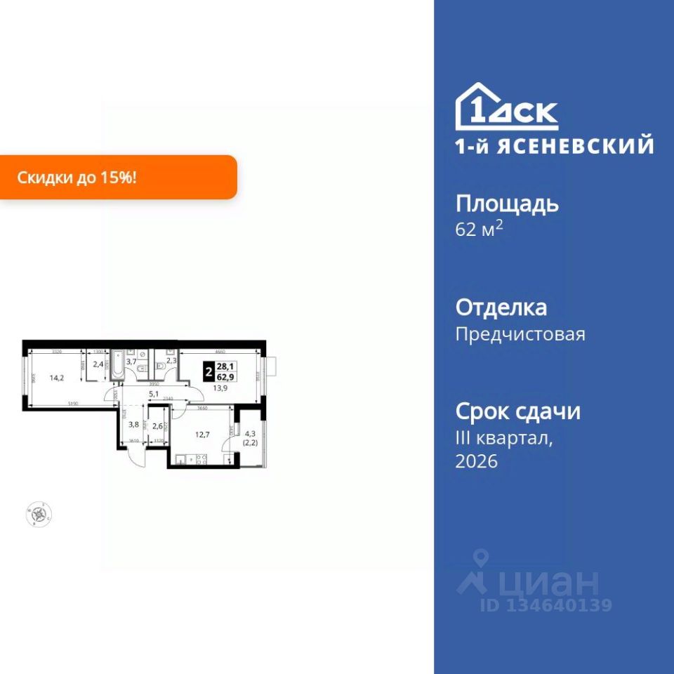 Продаётся 2-к квартира номер 431 общей площадью 62.9 кв.м. на 3-м этаже 18 этажного здания. Отделка Whitebox. Цена с учётом скидки.