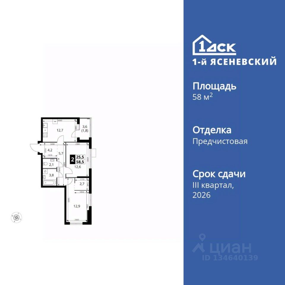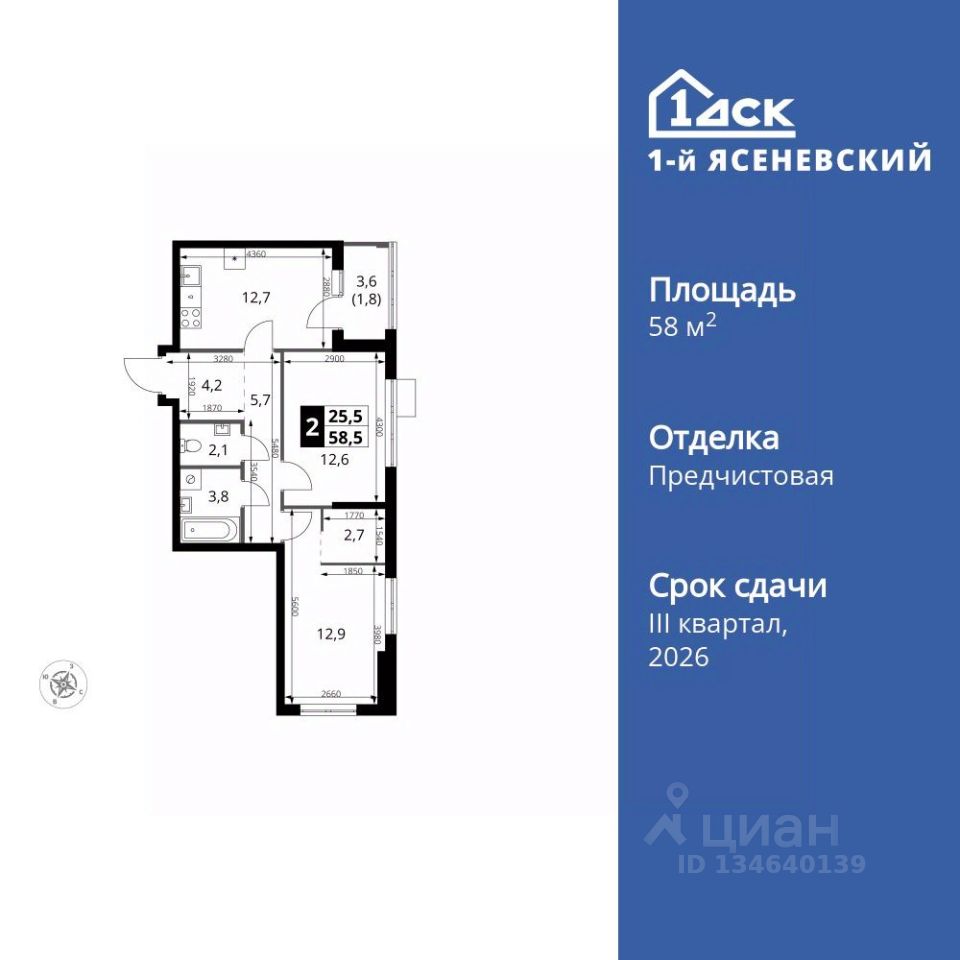 Продаётся 2-к квартира номер 532 общей площадью 58.5 кв.м. на 13-м этаже 18 этажного здания. Отделка Whitebox. Цена с учётом скидки.