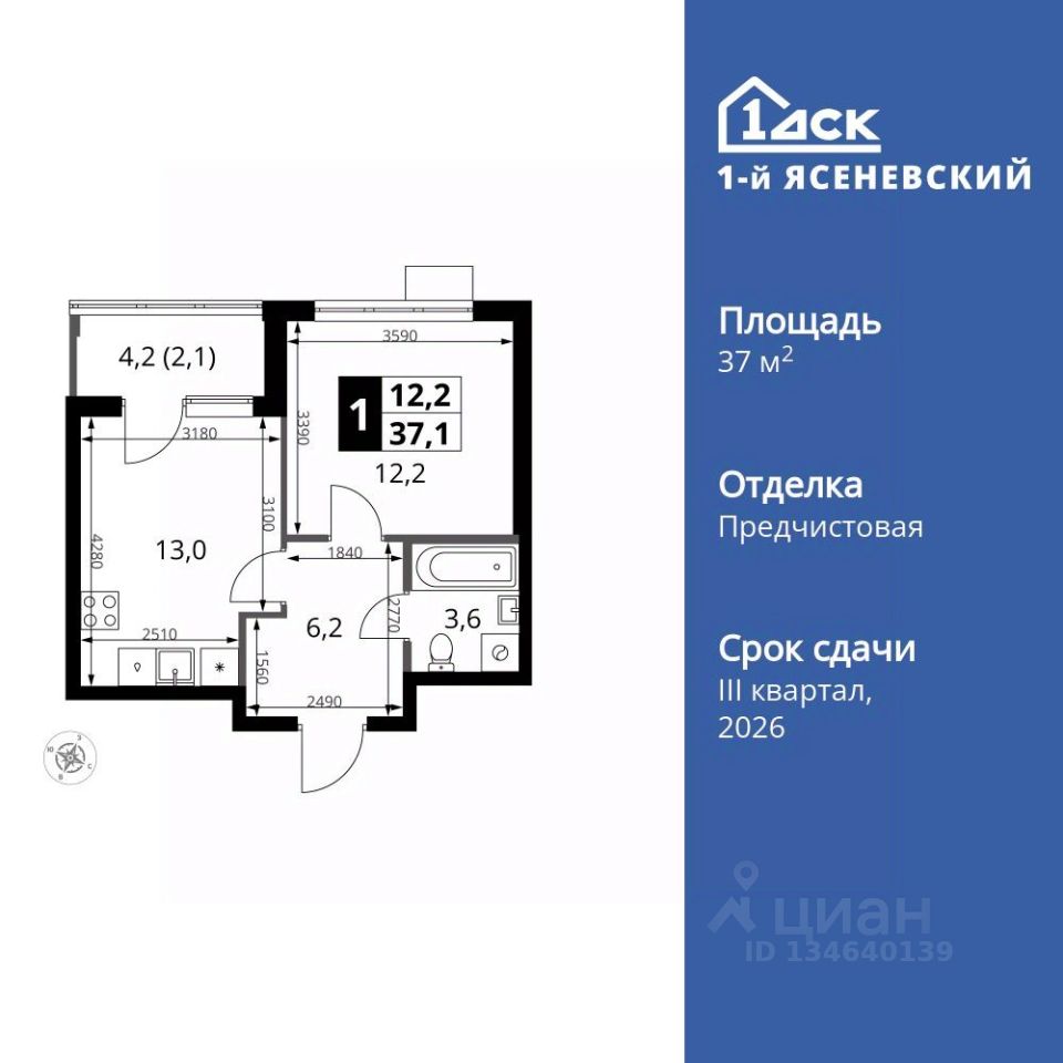 Продаётся 1-к квартира номер 560 общей площадью 37.1 кв.м. на 15-м этаже 18 этажного здания. Отделка Whitebox.