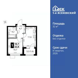 Продаётся 1-к квартира номер 564 общей площадью 32.8 кв.м. на 16-м этаже 18 этажного здания. Без отделки.