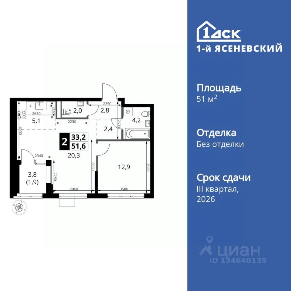Продаётся 2-к квартира номер 587 общей площадью 51.6 кв.м. на 18-м этаже 18 этажного здания. Без отделки. Цена с учётом скидки.