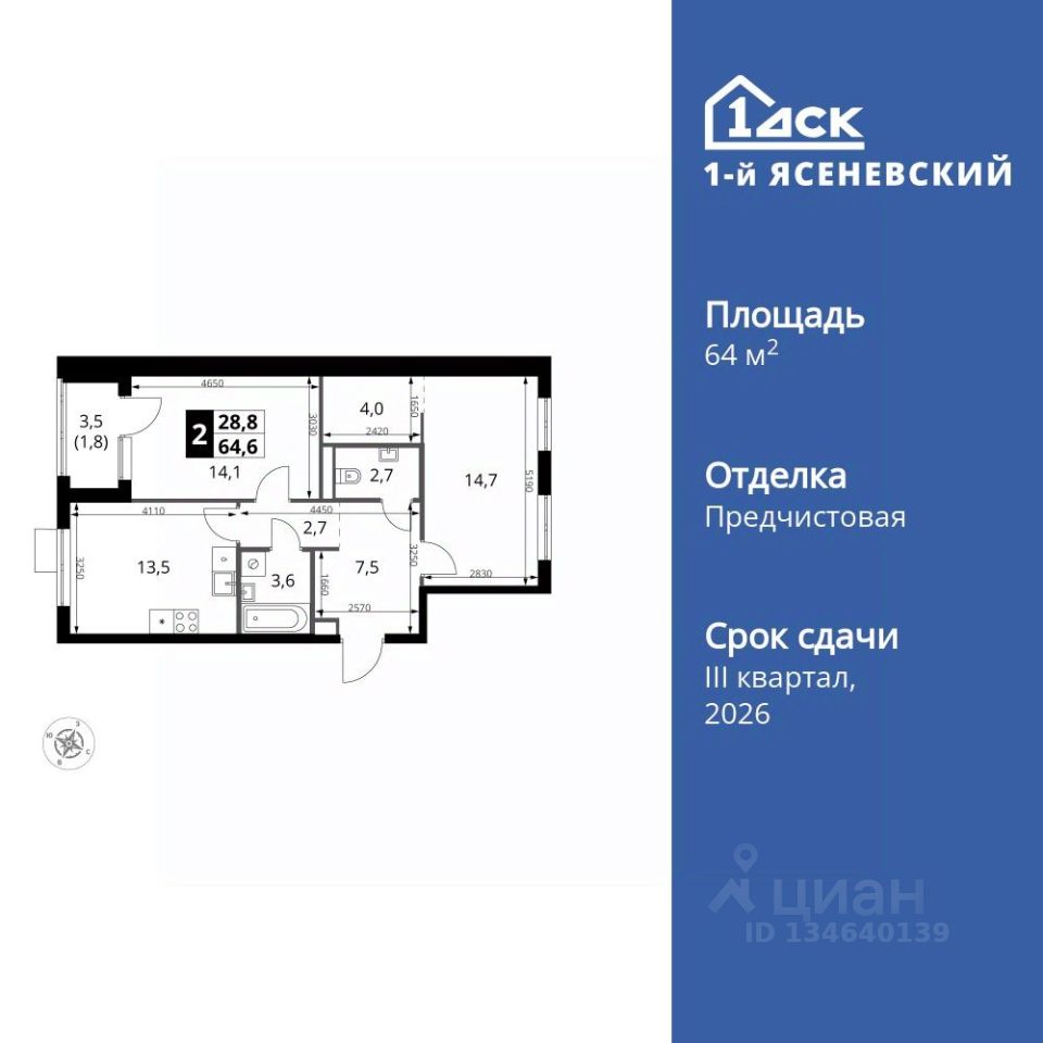 Продаётся 2-к квартира номер 656 общей площадью 64.6 кв.м. на 7-м этаже 16 этажного здания. Отделка Whitebox. Цена с учётом скидки.