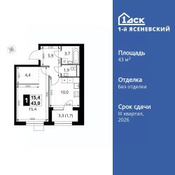 Продаётся 1-к квартира номер 593 общей площадью 43 кв.м. на 2-м этаже 16 этажного здания. Без отделки.