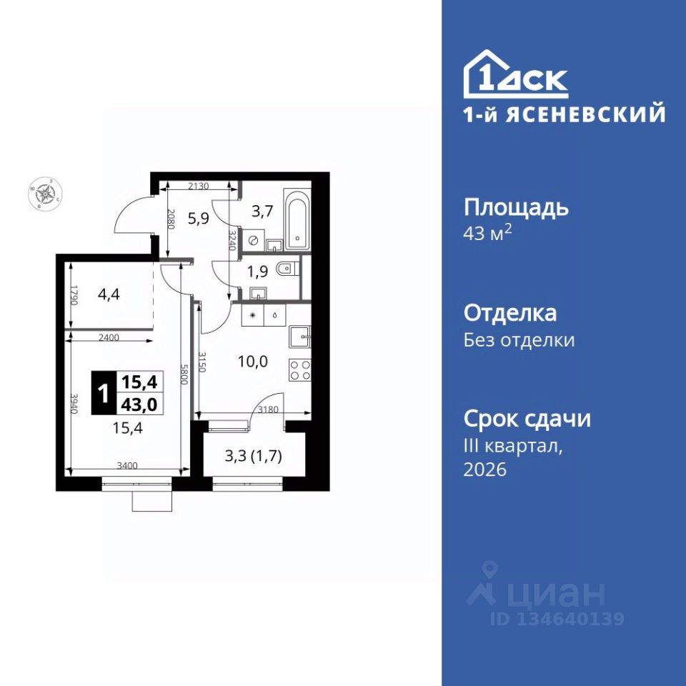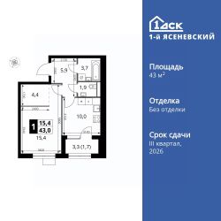 Продаётся 1-к квартира номер 615 общей площадью 43 кв.м. на 4-м этаже 16 этажного здания. Без отделки.
