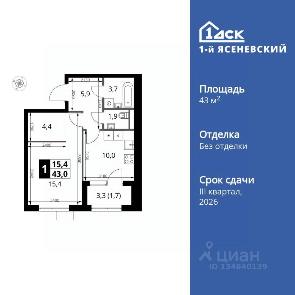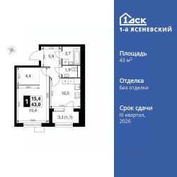 Продаётся 1-к квартира номер 714 общей площадью 43 кв.м. на 13-м этаже 16 этажного здания. Без отделки.