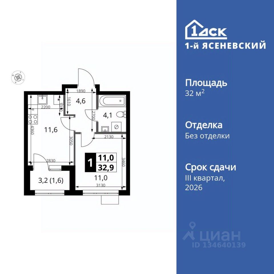 Продаётся 1-к квартира номер 730 общей площадью 32.9 кв.м. на 14-м этаже 16 этажного дома. Без отделки. Цена с учётом скидки!