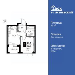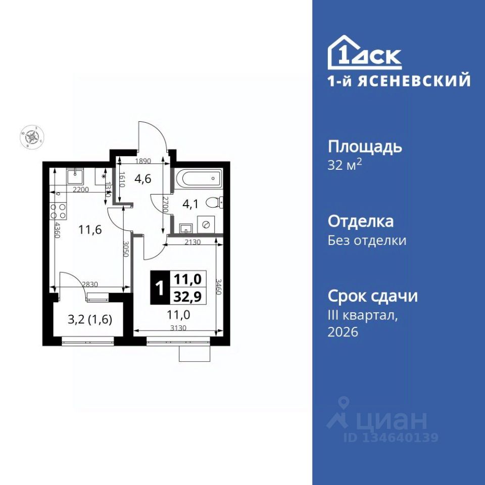 Продаётся 1-к квартира номер 730 общей площадью 32.9 кв.м. на 14-м этаже 16 этажного здания. Без отделки.