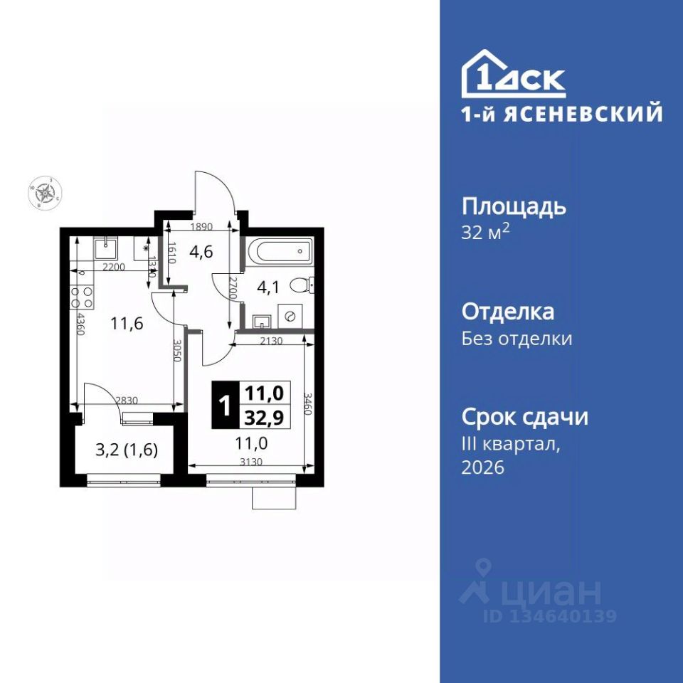 Продаётся 1-к квартира номер 752 общей площадью 32.9 кв.м. на 16-м этаже 16 этажного здания. Без отделки.