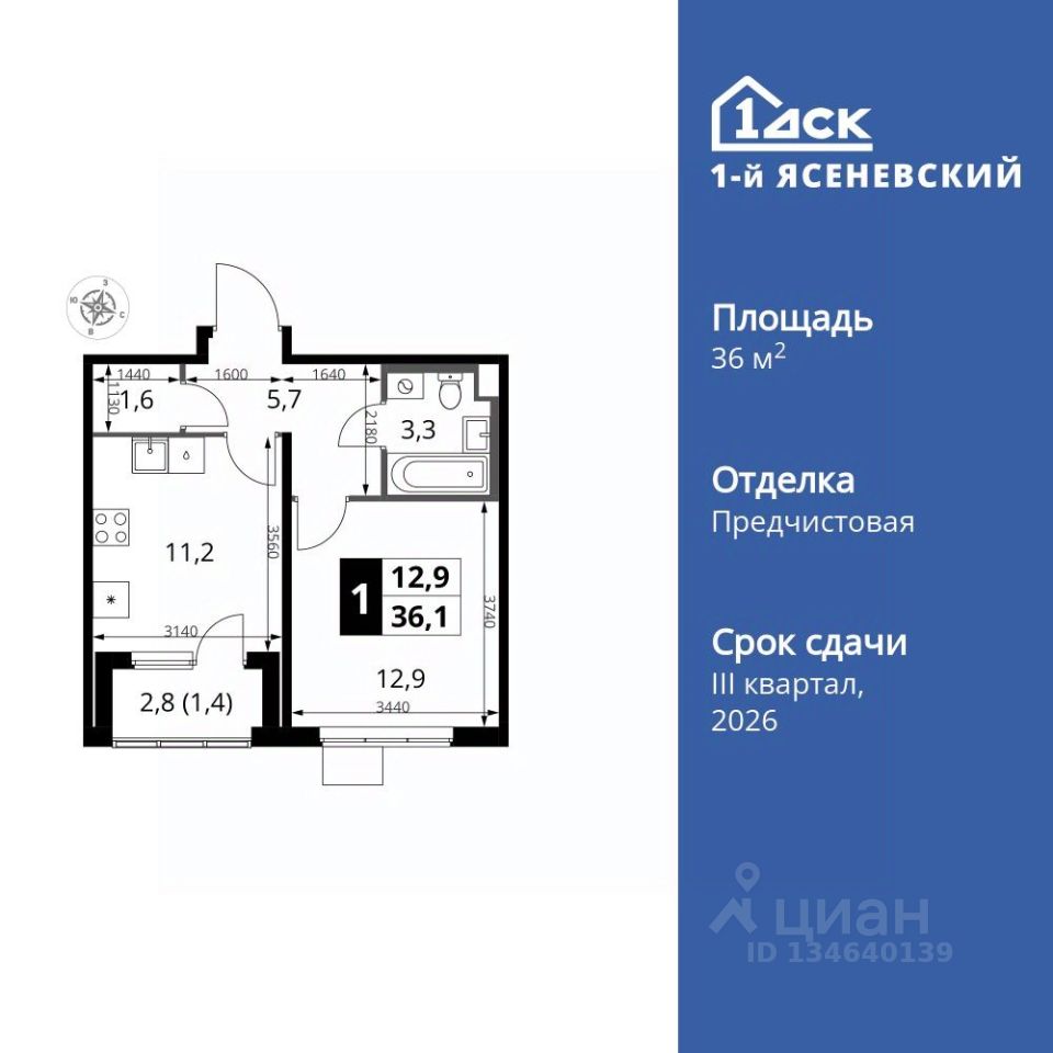 Продаётся 1-к квартира номер 39 общей площадью 36.1 кв.м. на 5-м этаже 16 этажного здания. Отделка Whitebox.