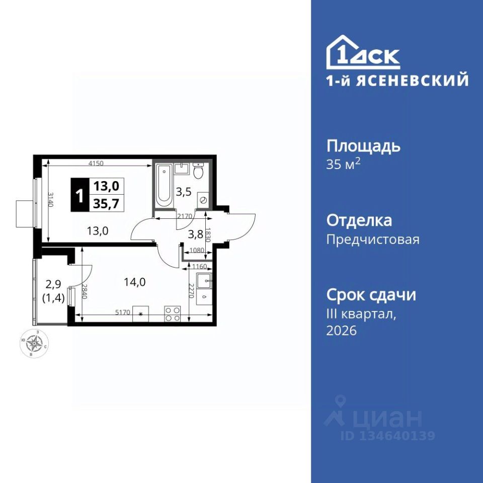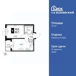 Продаётся 1-к квартира номер 122 общей площадью 35.7 кв.м. на 14-м этаже 16 этажного здания. Отделка Whitebox.