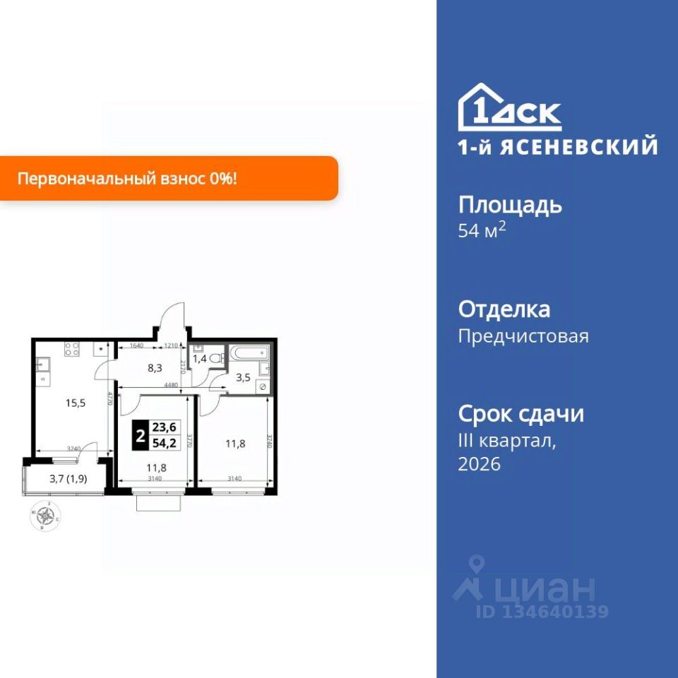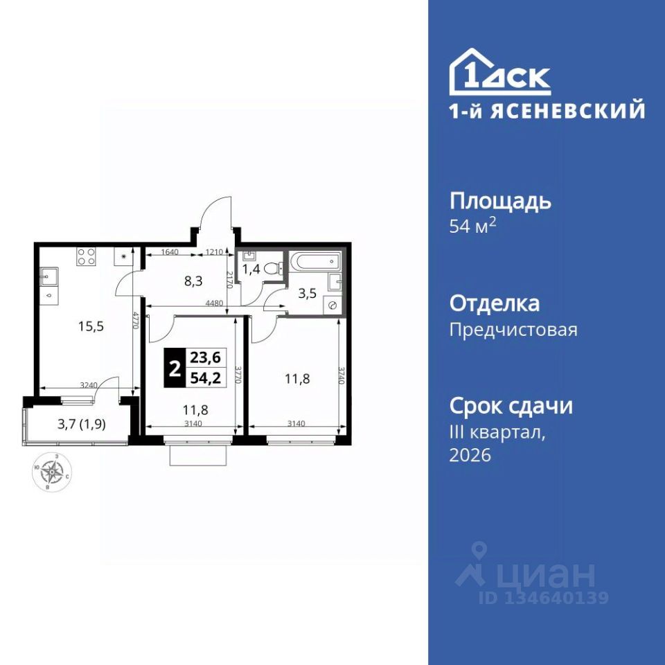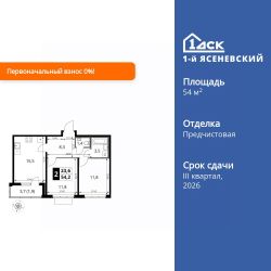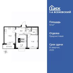 Продаётся 2-к квартира номер 130 общей площадью 54.2 кв.м. на 14-м этаже 16 этажного здания. Отделка Whitebox. Цена с учётом скидки.