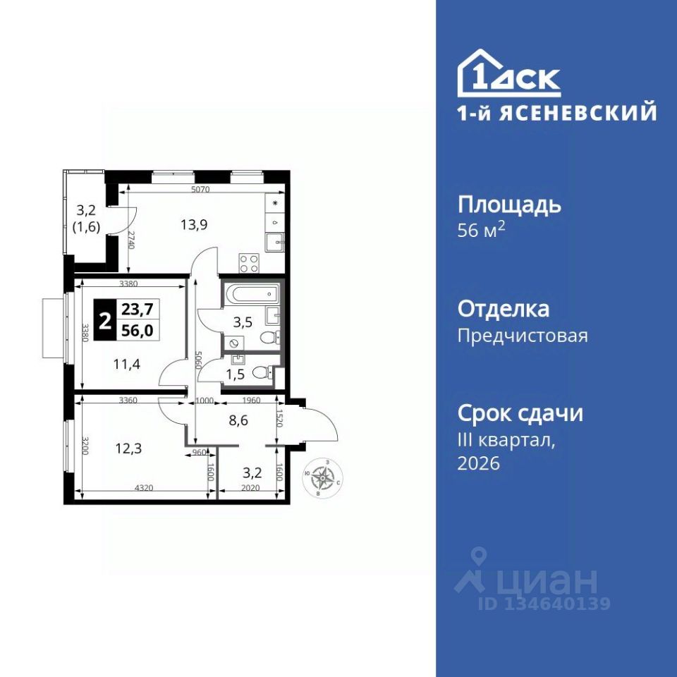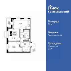 Продаётся 2-к квартира номер 143 общей площадью 56 кв.м. на 16-м этаже 16 этажного здания. Отделка Whitebox. Цена с учётом скидки.