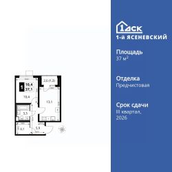 Продаётся 1-к квартира номер 177 общей площадью 37.1 кв.м. на 4-м этаже 18 этажного здания. Отделка Whitebox.