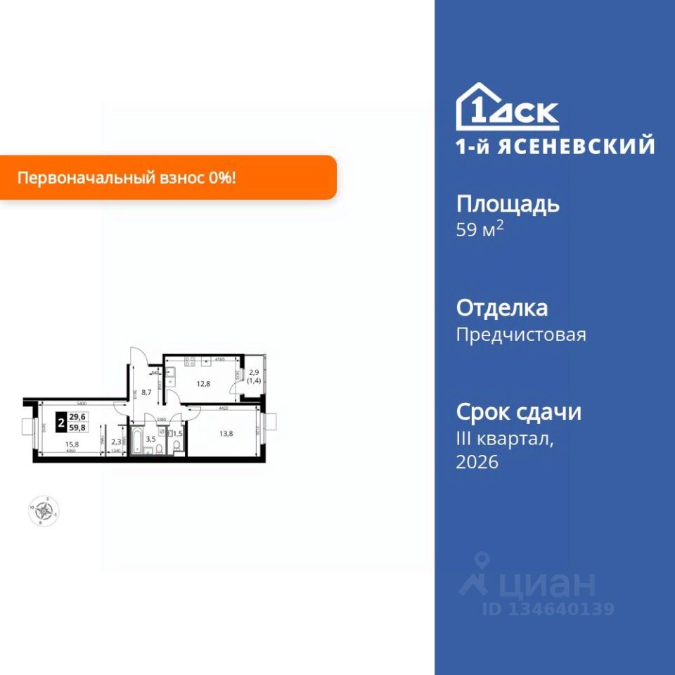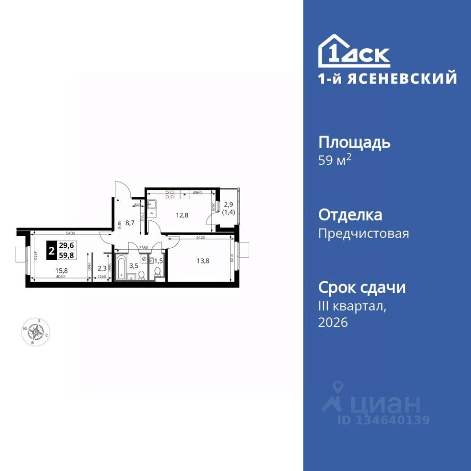 Продаётся 2-к квартира номер 194 общей площадью 59.8 кв.м. на 5-м этаже 18 этажного здания. Отделка Whitebox. Цена с учётом скидки.
