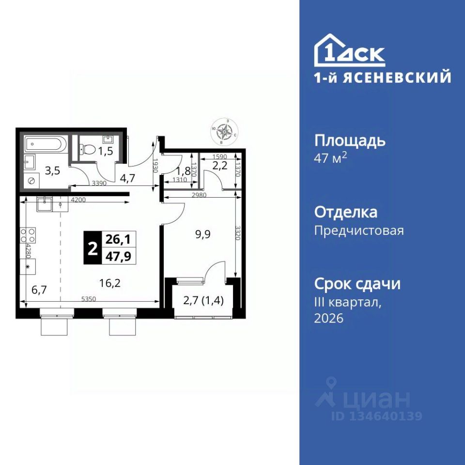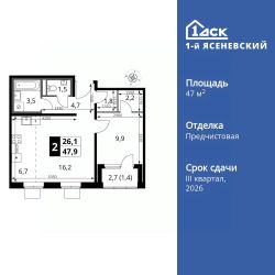 Продаётся 2-к квартира номер 198 общей площадью 47.9 кв.м. на 6-м этаже 18 этажного здания. Отделка Whitebox. Цена с учётом скидки.