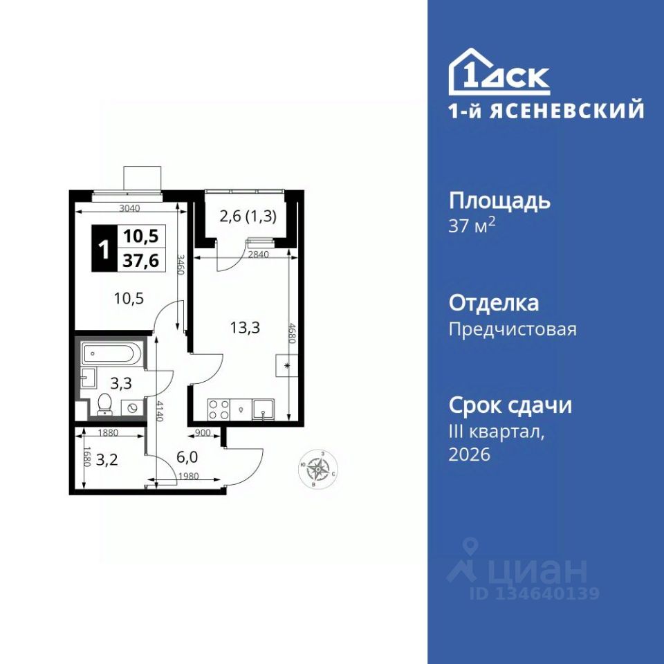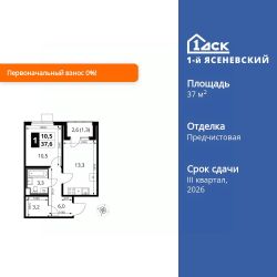 Продаётся 1-к квартира номер 210 общей площадью 37.6 кв.м. на 7-м этаже 18 этажного здания. Отделка Whitebox.