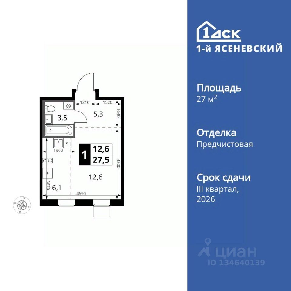 Продаётся квартира-студия номер 307 общей площадью 27.5 кв.м. на 16-м этаже 18 этажного здания. Отделка Whitebox.