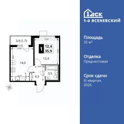 Продаётся 1-к квартира номер 311 общей площадью 35.9 кв.м. на 16-м этаже 18 этажного здания. Отделка Whitebox.