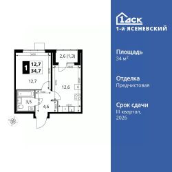 Продаётся 1-к квартира номер 312 общей площадью 34.7 кв.м. на 16-м этаже 18 этажного здания. Отделка Whitebox.