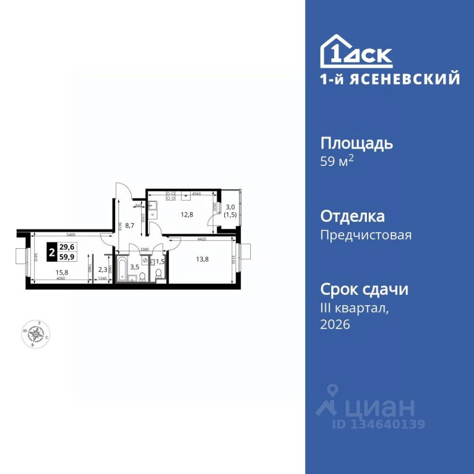 Продаётся 2-к квартира номер 315 общей площадью 59.9 кв.м. на 16-м этаже 18 этажного здания. Отделка Whitebox. Цена с учётом скидки.