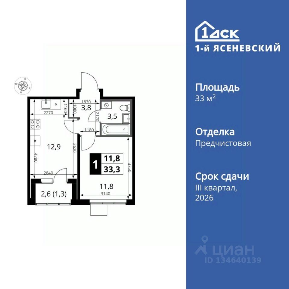 Продаётся 1-к квартира номер 328 общей площадью 33.3 кв.м. на 18-м этаже 18 этажного здания. Отделка Whitebox.