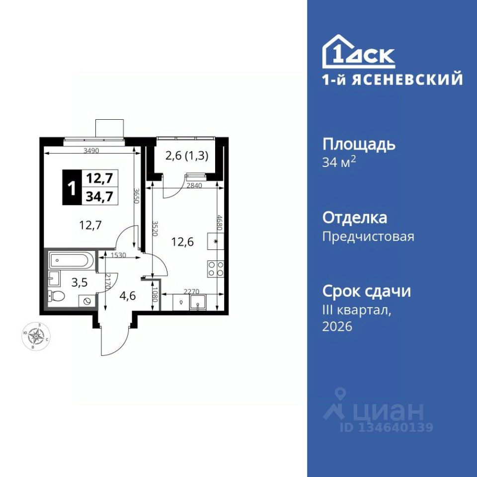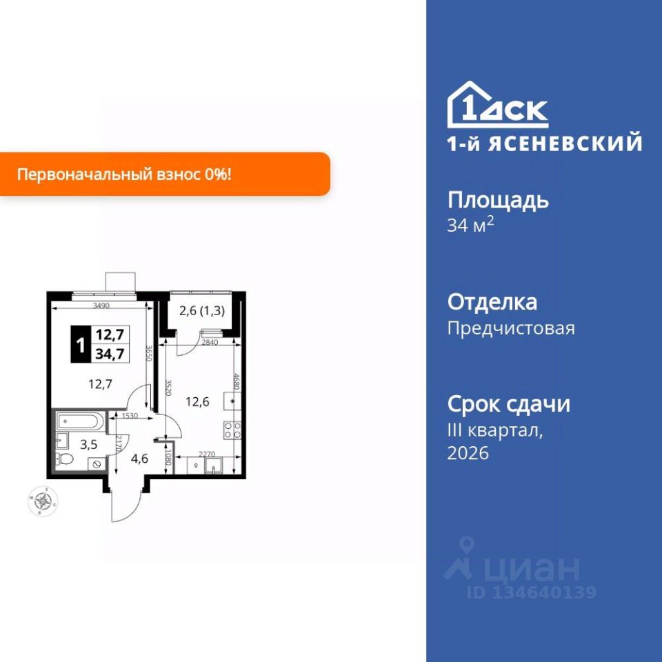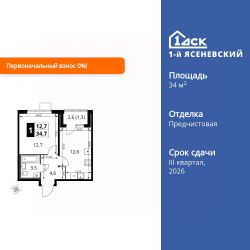 Продаётся 1-к квартира номер 334 общей площадью 34.7 кв.м. на 18-м этаже 18 этажного здания. Отделка Whitebox.
