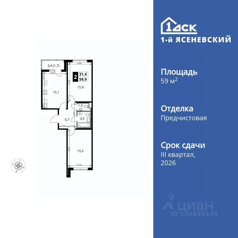 Продаётся 2-к квартира номер 338 общей площадью 59.9 кв.м. на 2-м этаже 9 этажного здания. Отделка Whitebox. Цена с учётом скидки.