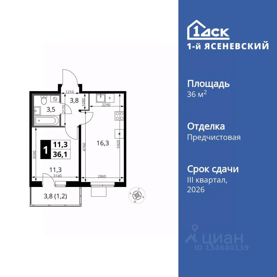 Продаётся 1-к квартира номер 359 общей площадью 36.1 кв.м. на 6-м этаже 9 этажного здания. Отделка Whitebox.